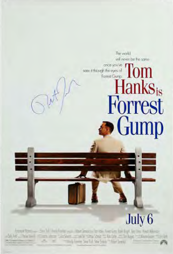 Une affiche signée par le réalisateur Robert Zemeckis de la promotion du drame Forrest Gump de Zemeckis, lauréat d’un Academy Award®. L’affiche montre Forrest (Tom Hanks) assis sur le banc où il dit sa célèbre phrase : « Ma maman a toujours dit que la vie était comme une boîte de chocolats. Vous ne savez jamais ce que vous allez obtenir. Cette affiche est imprimée sur papier glacé et signée à l’encre bleue. Il présente des plis le long des bords dus au roulage et des résidus de ruban adhésif à l’arrière.