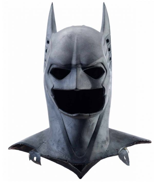 La combinaison sonar de Batman (Val Kilmer) Batcowl de la suite de super-héros de Joel Schumacher, Batman Forever. Batman portait son capot récemment repensé et modifié par une combinaison de sonar lorsque lui et Robin (Chris O’Donnell) se sont lancés dans leur combat final avec The Riddler (Jim Carrey) et Two-Face (Tommy Lee Jones). Ce capuchon en caoutchouc mousse a une paire de saillies en forme d’oreille en haut et des trous pour les yeux et la bouche. Il comporte trois pièces de Velcro® et une paire de pièces en tissu à l’intérieur de la section du col, pour l’attacher à la combinaison. Le capuchon présente quelques signes d’usure, notamment des résidus blancs à l’intérieur et à l’extérieur, une paire de petits trous – d’un côté de l’encolure et de l’arrière de la tête – et une légère fissure sur la section du menton du trou de la bouche.