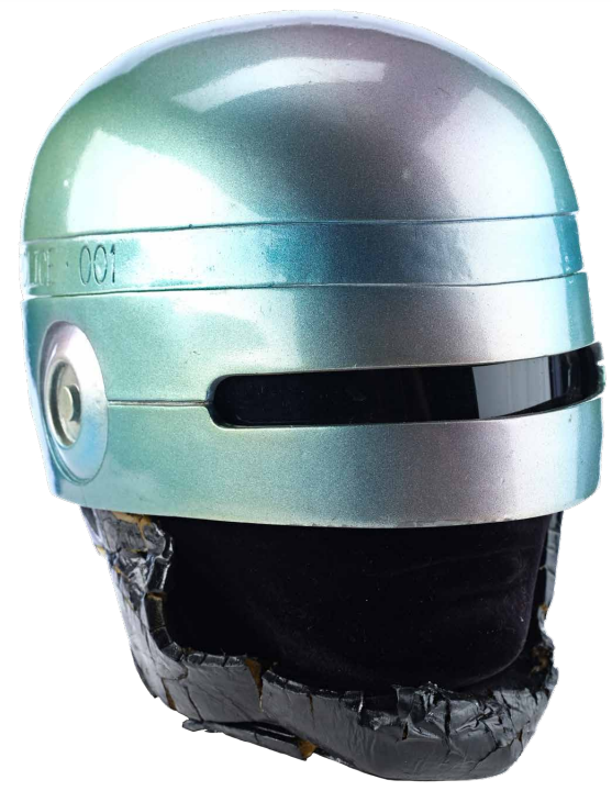 Le casque de Robocop (Peter Weller) de la suite d’action de science-fiction d’Irvin Kershner Robocop 2. Robocop portait son casque de patrouille signature tout en luttant contre la montée d’un nouveau stupéfiant appelé Nuke, et son créateur et distributeur Cain (Tom Noonan). Ce casque en résine et fibre de verre est peint en aqua clair métallisé et rehaussé d’un éclat violet. Il est doté d’un intérieur rembourré en mousse et Velcro® et d’une fixation vissée étiquetée « 1 », qui couvre l’arrière de la tête et du cou. Une visière est installée à l’intérieur. Une pièce de doublure de cou et de menton en mousse de latex noir est également fixée au casque. Ce lot présente des fissures et des écaillages partout, ainsi qu’une usure et un vieillissement importants de la doublure du cou et du menton. Cependant, il reste dans un état général passable.