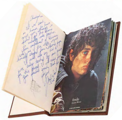 Un carnet dédicacé par Peter Jackson et les acteurs, One Ring promotionnel et un bug weta de la réalisation de l’adaptation de J.R.R. par Peter Jackson. L’épopée fantastique de Tolkien Le Seigneur des Anneaux. Ces lots ont été acquis directement de la succession du regretté légende du cinéma Sir Christopher Lee, qui incarnait le sorcier noir Saruman dans les films. Le petit livret relié en cuir présente un premier logo du titre en relief sur la couverture et contient le synopsis du film, avec des cartes postales des principaux acteurs, qui ont tous écrit de nombreux messages personnels sincères à Lee. Le One Ring promotionnel est enfermé dans une «roche» acrylique transparente avec une face hautement polie, et le logo du prototype est gravé et mis en évidence à l’encre. Le bug weta à l’échelle 1:1 – mascotte de la société d’effets spéciaux basée en Nouvelle-Zélande Weta Workshop – est moulé en laiton. Il y a un trou dans la base où une tige la soutenait autrefois. L’acrylique a jauni avec le temps et le livre a quelques traces d’usure et d’encre dues à la signature. Dimensions (anneau) : 4 cm x 6 cm x 7 cm ; (weta) : 20 cm x 15 cm x 6 cm.