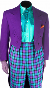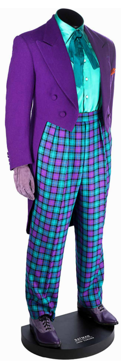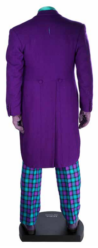 Costume de Joker (Jack Nicholson) du film de super-héros Batman de Tim Burton. Ce costume complet comprend des vêtements de diverses scènes du film, y compris le saccage du Joker au Gotham Museum of Art et le moment où il a tourné Bruce Wayne (Michael Keaton) dans l’appartement de Vicki Vale (Kim Basinger). Créés par le créateur de costumes nominé aux Oscars Bob Ringwood, les costumes du Joker ont été conçus pour exprimer l’état d’esprit déséquilibré du personnage. Ses costumes sont devenus de plus en plus vibrants et scandaleux au fur et à mesure qu’il s’enfonçait dans la folie tout au long du film. Nicholson lui-même a contribué à l’apparence de son personnage; le violet frappant correspond à celui de son équipe sportive préférée, les LA Lakers. Fabriqué sur mesure pour la production, le costume se compose d’un frac, d’une chemise, d’un pantalon à motifs, de gants, d’une cravate, d’un mouchoir et de chaussures de type richelieu. Doublé de tissu synthétique, le frac en laine violet présente de larges revers et plusieurs boutons recouverts sont cousus sur le devant, le dos et les poignets. Un mouchoir en satin orange est inséré dans la poche poitrine gauche de la veste. Plusieurs boutons en plastique blanc descendent sur le devant de la chemise en satin vert vif, et la cravate est faite d’un tissu semblable à de la soie gros-grain bleu sarcelle qui est noué dans un nœud lâche. Le pantalon est fait d’un tissu en laine et affiche un motif tartan violet, turquoise et orange vif. Une fermeture éclair dissimulée et une fermeture à agrafes ornent le devant du pantalon. Les gants en daim violet pâle complètent le détail en daim assorti sur les chaussures Oxford pointues en cuir violet, qui sont marquées « Jack Nicholson taille 9 ». Des usures mineures dues à l’utilisation de la production sont présentes sur le costume, notamment des résidus de maquillage sur le col de la chemise et plusieurs trous sur la veste, notamment sur le revers droit et le haut de la manche. La couture sur la couture arrière de la veste s’est partiellement défaite, exposant la chemise en dessous. Le costume est présenté sur un présentoir sur mesure.