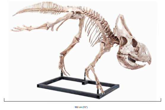 Un squelette de protoceratops de six pieds de la salle de diorama de J.A. La suite d’action-aventure de Bayona Jurassic World: Fallen Kingdom. Maisie Lockwood (Isabella Sermon) s’est cachée derrière le squelette du protoceratops dans la bibliothèque Lockwood alors qu’Eli Mills (Rafe Spall) emmenait M. Eversoll (Toby Jones) dans l’ascenseur voisin, qui menait à son centre de recherche souterrain. Privilégiant l’authenticité afin de réaliser la vision de Bayona consistant à « amener les dinosaures dans notre monde », les décorateurs ont recherché et loué des squelettes de fossiles coulés scientifiquement précis pour les scènes de Lockwood Mansion. Il s’agit d’une reproduction fabriquée de qualité recherche d’un dinosaure protoceratops (grec pour « Early Horned Face ») de la période du Crétacé. Il a été créé à partir de moules à haute résolution moulés à partir de fossiles réels mis au jour par une équipe de paléontologues associée au Denver Museum of Nature and Science, qui a découvert le fossile dans la formation Djadochta en Mongolie. Ce squelette sur mesure a été coulé dans des matériaux de résine plastique durables et monté avec une armature en acier inoxydable renforcée dans une pose de marche rigide et scientifiquement précise. Le modèle squelette se décompose en plusieurs composants pour le transport, et une base en acier est incluse pour l’affichage. Ce squelette est en excellent état. La pièce comprend une lettre d’authenticité du vendeur qui l’a fournie pour le tournage.