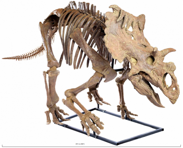 Un diorama squelette de kosmoceratops de 15 pieds de J.A. La suite d’action-aventure de Bayona Jurassic World: Fallen Kingdom. Owen Grady (Chris Pratt), Claire Dearing (Bryce Dallas Howard) et Maisie Lockwood (Isabella Sermon) ont utilisé les squelettes de dinosaures de la bibliothèque Lockwood comme couverture pour les aider à échapper à l’Indoraptor qui les chassait. Ce squelette particulier est bien visible par l’entrée principale de la bibliothèque. Privilégiant l’authenticité afin de réaliser la vision de Bayona consistant à « amener les dinosaures dans notre monde », les décorateurs ont recherché et loué des squelettes de fossiles coulés scientifiquement précis pour les scènes de Lockwood Mansion. Il s’agit d’une reproduction fabriquée de qualité recherche d’un kosmoceratops (grec pour « visage orné de cornes ») de la période du Crétacé supérieur. Il a été créé à partir de moules à haute résolution moulés à partir de fossiles réels mis au jour par une équipe de paléontologues associée au Denver Museum of Nature and Science, qui a découvert le fossile dans le sud de l’Utah, aux États-Unis. Ce squelette sur mesure a été coulé dans des matériaux de résine plastique durables et monté avec une armature en acier inoxydable renforcée dans une pose de marche rigide et scientifiquement précise. Le modèle squelette élaboré se décompose en plusieurs composants pour le transport, et une base en acier est incluse pour l’affichage. Ce squelette est en excellent état. Cette pièce comprend une lettre d’authenticité du vendeur qui l’a fournie pour le tournage.