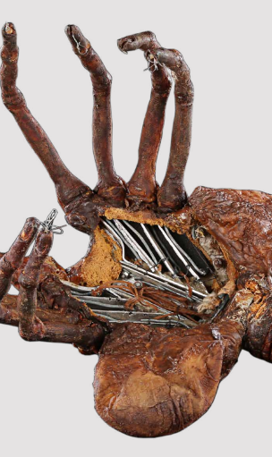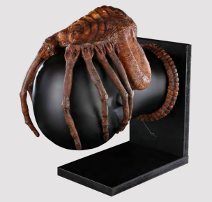 Un facehugger du film d’horreur de science-fiction de Ridley Scott Alien. Après que le navire minier Nostromo ait reçu une transmission d’une lune désolée, l’équipage a découvert des œufs mystérieux dans les entrailles d’un navire écrasé. Kane (John Hurt) s’en est trop approché et une créature s’est attachée à son visage. Le capitaine Dallas (Tom Skerritt) et le navigateur Lambert (Veronica Cartwright) l’ont amené à bord du Nostromo, mettant le reste de l’équipage en danger. Ce facehugger a été obtenu à partir de la collection de son créateur, la légende des effets spéciaux Roger Dicken, qui en est le propriétaire depuis la fin du tournage. Le facehugger a été conçu à l’origine par l’artiste surréaliste suisse HR Giger, qui était responsable de la création de l’esthétique Alien, y compris l’Alien lui-même, le navire écrasé sur lequel ils ont enquêté (« The Derelict ») et le « Space Jockey », la grande créature qu’ils ont trouvée à bord. Cependant, la conception initiale du facehugger de Giger a été considérablement modifiée. C’était à l’origine une créature plus grande qui se serait enroulée autour de l’extérieur du casque de Kane. Il a ensuite été repensé en collaboration avec le réalisateur Scott, l’écrivain Dan O’Bannon, Dicken et l’artiste Ron Cobb. Dicken a ensuite sculpté, moulé et construit la créature en utilisant un squelette en métal avec un torse en fibre de verre et en résine. La peau du Facehugger est en latex et présente des détails réalistes, notamment des veines, des rides et des ligaments. La queue flexible est faite de mousse de latex pour lui permettre de s’enrouler autour du cou de la victime. Un fil monofilament dépasse de l’extrémité de la queue et des doigts, qui auraient été tirés pour donner l’impression que le facehugger resserre sa prise. Les jambes comportent des noyaux de fil articulés attachés au squelette. Les sacs en latex de chaque côté ont un poids en forme d’œuf à l’intérieur pour s’assurer qu’ils sont correctement suspendus au visage de Kane. Sur la face inférieure du facehugger, le squelette en métal est exposé. La pièce présente une certaine usure due à l’utilisation et au vieillissement de la production, et Dicken a entrepris des travaux de réparation cosmétique à la surface et aux sacs d’embryons. Le facehugger est décoloré en raison de l’âge, passant d’une couleur de peau pâle à un brun plus foncé. Une partie de la mousse de latex sur la queue s’est écaillée, tout comme une partie du latex sur les pattes. Il est présenté sur un présentoir sur mesure, le gardant dans sa pose emblématique, et est accompagné d’une lettre d’authenticité de Dicken.