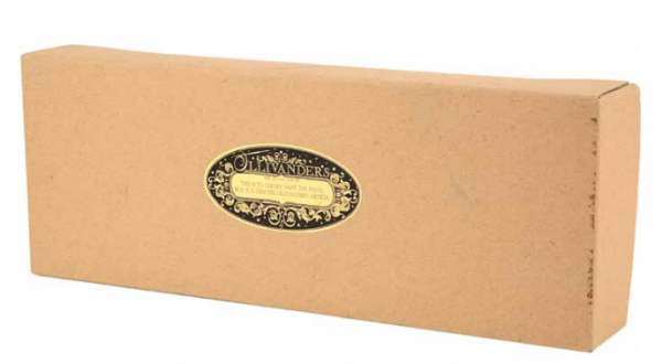 Une boîte à baguettes d’Ollivander du film d’aventure fantastique de Chris Columbus Harry Potter et la pierre philosophale. Des boîtes à baguettes ont été utilisées comme pansement à l’arrière-plan de la boutique de baguettes de Garrick Ollivander (John Hurt). Ces boîtes ont été offertes aux participants de la première mondiale du film à Leicester Square en 2001. La boîte est faite de carton marron et est fermée hermétiquement. Il comporte deux autocollants, un bleu pâle au bout et un faux or et noir sur le dessus avec le titre « Ollivander’s, Makers of fine wands since 382 BC. et la phrase « Ceci certifie que la boîte à baguettes est un véritable article d’Ollivander. » La boîte montre de légères marques d’utilisation en production.