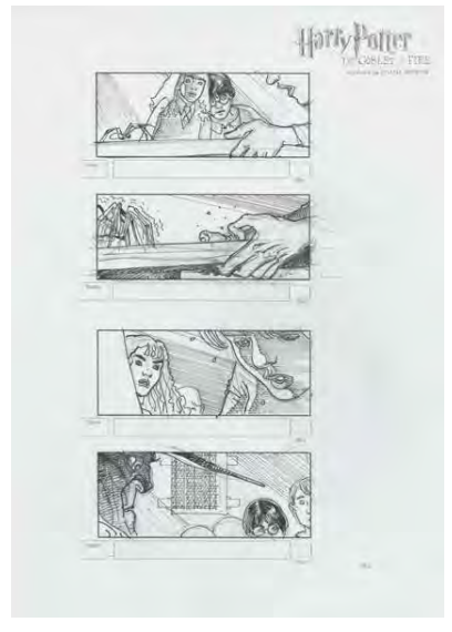 Une illustration de storyboard de Sylvain Despretz dessinée à la main de la production de la suite d’aventures fantastiques de Mike Newell, Harry Potter et la coupe de feu. Ce storyboard représente Harry Potter (Daniel Radcliffe) et Hermione Granger (Emma Watson) réagissant à une araignée maudite par leur nouveau professeur de Défense contre les forces du mal, Mad-Eye Moody (Brendan Gleeson). Ce storyboard est dessiné sur papier au stylo et au crayon. Il est signé au crayon par le scénariste Sylvain Despretz dans le coin inférieur droit. « Harry Potter », « La Coupe de Feu » et « Storyboard by SYLVAIN DESPRETZ » sont imprimés en noir dans le coin supérieur droit. L’œuvre montre une légère rainage de bord.