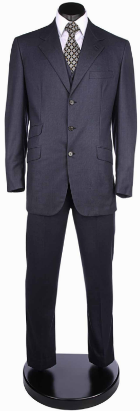 Le costume trois pièces de James Bond (Pierce Brosnan) du film GoldenEye de Martin Campbell. Bond portait son costume Brioni alors qu’il se retrouvait face à son ancien allié Alec Trevelyan (Sean Bean). Après que Bond et Natalya (Izabella Scorupco) se soient échappés des griffes de Trevelyan, ils se sont retrouvés interrogés par le ministre russe de la Défense Mishkin (Tchéky Karyo), avant de poursuivre le général Ourumov (Gottfried John) dans les rues de Saint-Pétersbourg dans un char. Le costume est fabriqué par Brioni, la maison de couture pour hommes sur mesure qui a créé la majorité des costumes de luxe portés par Brosnan dans le rôle de James Bond. Brosnan a fait partie intégrante du processus de développement du look de Bond et a été consulté sur la façon dont son personnage s’habillerait tout au long de son mandat. Comme l’a raconté plus tard la costumière Lindy Hemming : « Nous voulions qu’il ait l’air moderne, mais pas à la mode comme quelqu’un dans la publicité… Les propres exigences de Pierce étaient que les créations devaient refléter la légèreté de l’homme moderne, tout en restant sveltes et lisses. Le costume est fait de laine bleue avec une doublure à logo Brioni effet soie. Le costume a été spécialement conçu pour Brosnan dans le rôle, avec la veste étiquetée « Brioni, Roma » et comportant une étiquette de costumiers Angels & Bermans, qui se lit « 1995 Goldeneye Pierce Brosnan ». Le gilet et le pantalon comportent tous deux une description similaire à l’intérieur. Une chemise blanche et une cravate ont été ajoutées pour compléter le look du costume, qui est présenté sur un affichage sur mesure comportant le titre du film et une description de la tenue sur mesure. La combinaison a une usure minimale due à l’utilisation et à l’âge de la production.