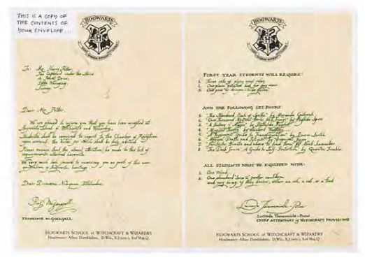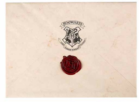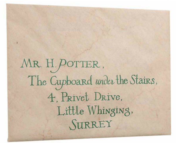 Owl Post a inondé la maison Dursley de lettres informant Harry Potter (Daniel Radcliffe) de son acceptation à Poudlard – malgré les meilleurs efforts d’Oncle Vernon (Richard Griffiths). L’enveloppe est faite de papier effet marbre, avec l’adresse de Harry imprimée en vert sur le devant de l’enveloppe et l’écusson de Poudlard au verso. L’enveloppe du héros comporte un véritable sceau de cire rouge de Poudlard, contrairement aux nombreuses versions entièrement imprimées qui ont également été utilisées dans la scène. L’enveloppe reste scellée avec une lettre contenue à l’intérieur et est en excellent état, avec seulement un petit éclat au sceau de cire. L’enveloppe est accompagnée d’une lettre de donation imprimée de Warner Bros., d’une copie de la lettre contenue à l’intérieur et d’une couverture photocopiée d’une édition 2001 de USA Weekend mettant en vedette Radcliffe ouvrant une lettre similaire.