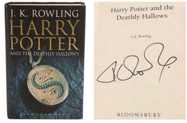 Un exemplaire dédicacé par J. K. Rowling de Harry Potter et les reliques de la mort, le dernier livre de sa série en sept parties Harry Potter. Après la sortie de l’adaptation cinématographique finale en 2011, cette édition du livre a été publiée par Bloomsbury et dédicacée par Rowling. Le livre est une première édition cartonnée avec la couverture en papier destinée aux adultes avec le titre et une image d’un horcruxe. La troisième page est signée par Rowling à l’encre noire. Le livre montre des signes mineurs d’usure, le haut et le bas de la couverture ont été légèrement pliés, et il y a de légères bosses et des coins pliés sur les pages.