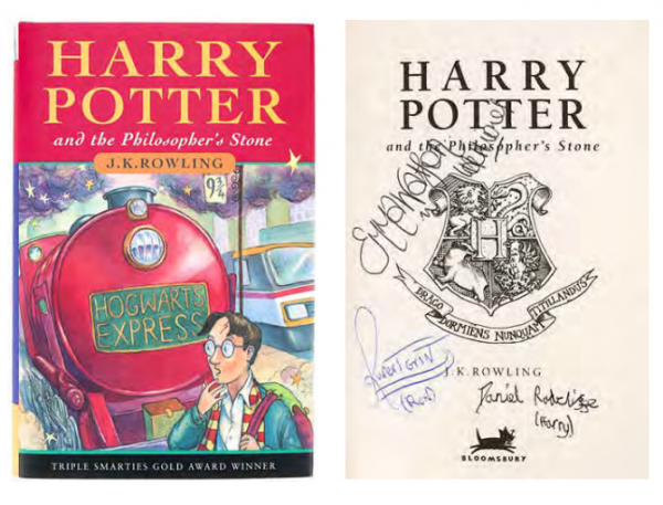Un exemplaire du roman Harry Potter et la pierre philosophale dédicacé par les trois acteurs principaux de l’adaptation cinématographique. Le livre cartonné, du 29e tirage, est dédicacé par Daniel Radcliffe, Emma Watson et Rupert Grint au stylo à bille noir et bleu sur la page de titre, et présente des illustrations de couverture de Harry devant le Poudlard Express à la gare de King’s Cross, avec une image du professeur Dumbledore au verso. Le livre reste en très bon état, avec de très légères usures sur les bords de la jaquette.