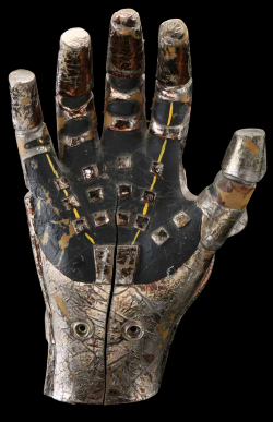 La main de C-3PO (Anthony Daniels) dans Star Wars: L’Empire contre-attaque d’Irvin Kershner. En tant que droïde protocolaire bavard, Daniels portait des gants d’apparence mécanique tout au long du film. Il est probable que ce gant droitier ait également été utilisé lors de la production de Star Wars : Le Retour du Jedi de Richard Marquand. Ce gant est fait d’uréthane flexible moulé peint en argent et bronze, avec des paumes noires, des rayures jaunes le long des doigts le long de la paume, une fente dans la paume pour mettre le gant sur l’acteur et des détails mécaniques striés sur les articulations et les articulations. Deux boutons-pression en métal sont fixés au poignet pour boutonner le gant du costume de Daniels. Le gant présente des signes d’usure et d’âge, notamment de la peinture écaillée et de la rigidité de l’uréthane, ainsi qu’une décoloration à l’endroit où se trouvaient autrefois les bagues, et se présente sur un présentoir en acrylique.