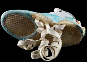 Les Nike MAG 2015 auto-lacés de Marty McFly (Michael J. Fox) tirés de la suite d’aventure de science-fiction de Robert Zemeckis, Retour vers le futur, partie II. Doc Brown (Christopher Lloyd) a amené Marty à l’année future de 2015 et lui a donné un ensemble futuriste pour l’aider à s’intégrer, y compris une paire de Nike MAG 2015. Ces baskets montantes sont fabriquées dans un tissu synthétique gris souple sur une mousse mouchetée de bleu et une semelle en caoutchouc transparent. Elles sont dotées d’un rembourrage en similicuir blanc le long de l’ouverture et d’une sangle assortie maintenant un talon en mousse blanche à l’arrière de chaque chaussure. Sur les côtés des chaussures se trouvent des logos Nike blancs; la chaussure droite comporte également des éléments d’éclairage pratiques derrière le logo Nike sur la sangle supérieure, dans les sections colorées sur le côté du talon et dans l’élément transparent sur le côté de la semelle elle-même. Il y a aussi un cordon d’alimentation gris qui sort de cette chaussure vers un nouveau bloc d’alimentation noir qui, en appuyant sur un interrupteur, allume et éteint les lumières. La bonne basket a été créée par le département des effets spéciaux pour que les lacets plats sortent du bas de la chaussure. Ceux-ci ont été utilisés pour créer l’effet d’auto-laçage, avec un membre d’équipage allongé sous une plate-forme surélevée, sur laquelle les chaussures se tenaient, et tirant les sangles serrées par le dessous. Les Nike MAG présentent un âge et une usure, et les composants en mousse ont subi une restauration pour reconstruire les fissures, l’effritement et certains éléments manquants. Les bandes lumineuses électroluminescentes de la bride supérieure et de la semelle de la chaussure droite, ainsi que les lumières LED colorées de son talon, ont également subi une restauration pour leur permettre de s’allumer à nouveau. Les semelles, backstraps et autres éléments en mousse des chaussures sont particulièrement délicats.