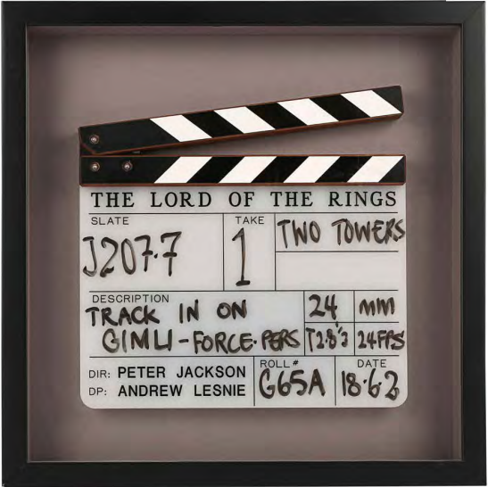 Un clap du décor de l’adaptation de J.R.R. par Peter Jackson. L’épopée fantastique de Tolkien Le Seigneur des Anneaux. Le clap se compose d’une plaque acrylique blanche avec un clap en bois fixé sur le dessus. Le titre de la trilogie et les noms du réalisateur Peter Jackson et du directeur de la photographie Andrew Lesnie sont gravés en noir. Le tableau affiche un certain nombre de champs remplis avec un marqueur noir, y compris l’ardoise, la prise, la description de la scène et la date. Il montre toujours le dernier plan pour lequel il a été utilisé, décrit comme « Track in on Gimli ». Accompagnée d’une lettre d’authenticité de New Line Cinema, la planche est toujours stockée dans le cadre d’origine dans lequel elle a été présentée par New Line : une boîte d’ombre personnalisée avec cadre noir et monture grise. Le cadre présente quelques petits éclats au bord de la moulure.