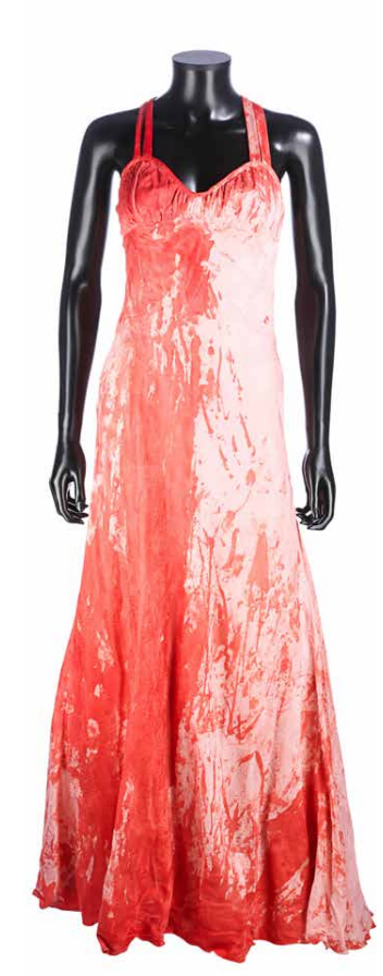 La robe de bal sanglante de Carrie White (Chloë Grace Moretz) du remake d’horreur de Kimberly Pierce Carrie (2013). Carrie portait sa robe ensanglantée après qu’un seau de sang de porc ait été renversé sur elle pendant le bal et tout au long de son déchaînement qui a suivi dans la ville. La robe longue au sol est en mousseline rose avec un motif floral subtil et un ourlet trapèze ondulé. Il présente un décolleté en cœur avec des bretelles fines et une ceinture assortie qui s’attache derrière. Il y a une courte fermeture éclair sous le bras gauche et un jupon rose cousu à l’intérieur. Une étiquette à l’intérieur indique « Blood Bucket – Carrie Hero » écrit au stylo noir. La robe est fortement tachée de sang de scène et il y a quelques petits trous autour de l’ourlet dus à l’utilisation pendant la production.