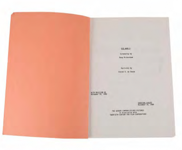 Un scénario de tournage de la suite du thriller d’action de Renny Harlin Die Hard 2. John McClane (Bruce Willis) a été contraint de protéger l’aéroport international de Dulles d’un groupe de terroristes. Ce script papier dactylographié de The Gordon Company