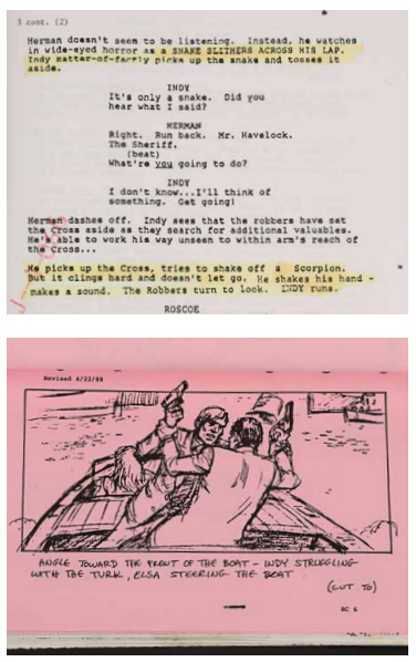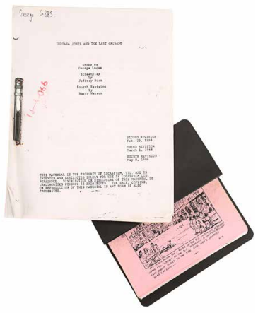 Un script annoté et des storyboards de la suite d’action-aventure de Steven Spielberg, Indiana Jones et la dernière croisade. Ces articles appartenaient au concepteur d’effets spéciaux George Gibbs, lauréat d’un Academy Award®. Ce script comprend 148 pages, avec des révisions blanches, roses et jaunes, sécurisées avec une attache métallique. Il comprend de nombreuses annotations manuscrites de Gibbs, faites pendant la production. Les storyboards comprennent 87 pages, reliés dans un petit dossier en plastique noir et imprimés sur papier rose et blanc. Ils montrent la poursuite en bateau à travers Venise, quand Indy (Harrison Ford) et Elsa (Alison Doody) ont été poursuivies par la Confrérie de l’épée cruciforme. Chaque page représente un plan de la séquence, avec des notes sur les mouvements de caméra et les effets spéciaux manuscrites à la fois sur l’image et en dessous. Le script montre quelques signes d’âge, avec quelques marques sur la page de titre, des bords ondulés et des marques de rouille transférées de l’attache en papier métallique. Dimension scénarimages : 8 cm x 13 cm x 3 cm (7 ¼” x 5” x 1 ¼”)