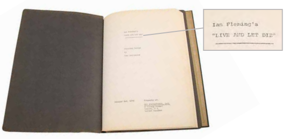 Un scénario de tournage utilisé pour la production du film Bond Live and Let Die de Guy Hamilton. Le scénario du tournage fait 121 pages, y compris la page de titre, qui est datée du « 2 octobre 1972 », et les crédits du scénariste Tom Mankiewicz. Il est relié dans une carte verte avec la couverture indiquant « Ian Fleming’s Live and Let Die » et à nouveau relié dans une reliure cartonnée sarcelle foncée avec une page intérieure portant une étiquette manuscrite indiquant « 93-32 ». à deux reprises. Les annotations tout au long du script incluent un soulignement imprimé pour mettre en évidence les accessoires et les effets visuels requis pour le tournage. Le script de prise de vue montre des signes mineurs d’usure, mais seule la couverture intérieure est déformée.