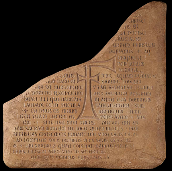 Une tablette du Graal de la suite d’action-aventure de Steven Spielberg, Indiana Jones et la dernière croisade. La tablette du Graal était l’un des deux marqueurs laissés par un groupe de chevaliers pour guider les aventuriers vers le Temple du Soleil, où le Saint Graal était gardé sous l’œil vigilant du Chevalier du Graal (Robert Eddison). Il est entré en possession de Walter Donovan (Julian Glover), qui l’a gardé dans son appartement de New York. Après la disparition du professeur Henry Jones (Sean Connery) lors de sa recherche du deuxième marqueur, Donovan a enrôlé Indiana Jones (Harrison Ford) pour retrouver son père disparu, et à son tour le Graal. Après qu’on lui ait montré la tablette du Graal dans la maison de Donovan, Indy a pris un avion pour Venise, où il a rapidement découvert le deuxième marqueur. La partie supérieure de la tablette du Graal est manquante, perdue dans les âges, mais Indy a traduit l’inscription restante comme « …qui boit l’eau que je lui donnerai, dit le Seigneur, aura une source en lui jaillissant pour la vie éternelle . Qu’ils m’amènent à ta montagne sainte, là où tu habites. À travers le désert et à travers les montagnes jusqu’au Canyon du Croissant de Lune, jusqu’au temple où la coupe qui contient le sang de Jésus-Christ réside pour toujours ». Le texte est un mélange de psaumes latins, d’écritures retraduites et de passages inventés. La tablette est moulée dans du plâtre, peinte en brun pour reproduire une finition en grès et intentionnellement vieillie pour avoir l’air ancienne. Le texte est gravé dans la tablette, avec le reste de la croix. La pièce présente une certaine usure due à l’utilisation et à l’âge de la production, avec quelques rayures et éraflures sur la peinture, notamment au dos de la tablette.