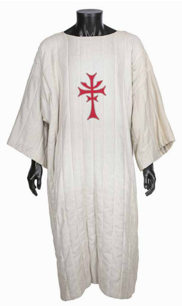 La tunique du chevalier du Graal (Robert Eddison) de la suite d’action-aventure de Steven Spielberg, Indiana Jones et la dernière croisade. Le chevalier portait sa tunique lorsque Indiana Jones (Harrison Ford) est arrivé dans la chambre du Temple du Soleil, où il a dû passer le test final et choisir le vrai Saint Graal. La tunique à manches courtes est confectionnée dans un tissu matelassé de couleur crème. Le devant est décoré d’un emblème de la croix rouge (symbole de la Confrérie de l’épée cruciforme), souligné de fil à broder en argent métallisé. Plusieurs nœuds noués descendent dans le dos et chaque épaule est dotée d’un rivet en métal. Une étiquette Bermans & Nathans est collée à la doublure : « Robert Eddison, 9774, Indiana Jones III, Eddy ». Le vêtement présente une usure mineure, notamment de légères éraflures sur le fil métallique et une décoloration du tissu, tandis que certaines des attaches au dos présentent des extrémités effilochées.