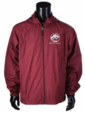 Une veste d’équipage Dino Costume de la suite d’action-aventure de Colin Trevorrow Jurassic World. Des vestes ont été offertes aux membres du département des costumes qui ont travaillé sur la production. Confectionnée en polyester bordeaux, la veste imperméable Sport-Tek® est dotée d’une capuche, de poignets élastiqués, d’une fermeture zippée et de bascules noires. Un logo Jurassic World brodé en gris orne la poitrine gauche, avec le texte « Dino Costume Crew » situé en dessous. Doublée d’une combinaison de jersey gris et de tissu semblable à une maille, la veste est étiquetée comme une taille moyenne et affiche des fils lâches et un léger pincement sur le texte brodé.